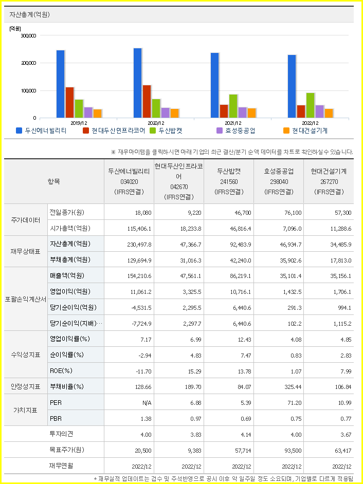 2022년 9월 연결 기준 전년 동기 대비 매출은 41.6%, 영업이익은 20.9% 증가, 당기순이익은 적자전환했다. 순이익은 에너비티와 밥캣의 매출 증가와 이자비용 감소로 영업외수지 개선에도 불구하고 두산메카텍과 두산밥콕의 매출로 적자 전환했다. 자체 기술을 통한 국내 무탄소 시장 진입을 추구합니다. 원료 공급사와의 협력을 통해 배터리 재활용 사업의 선순환 구조를 구축하고, 급성장하는 리튬 배터리 시장에 적극 참여할 계획입니다.