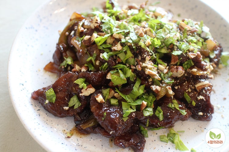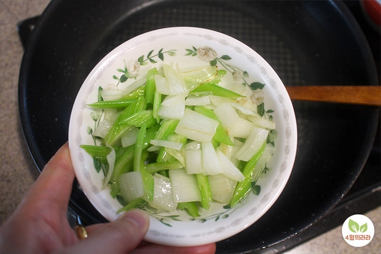 샐러리 2줄(140g), 돼지고기 앞다리살 150g, 맛술 1큰술, 고춧가루 – 간장 1.5큰술, 굴소스 1/2큰술, 액젓 1/4큰술, 설탕 1/3큰술, 물 2큰술, 식용유 2큰술, 다진마늘 1큰술, 참기름 1/2큰술 ※ 표준큰술.
